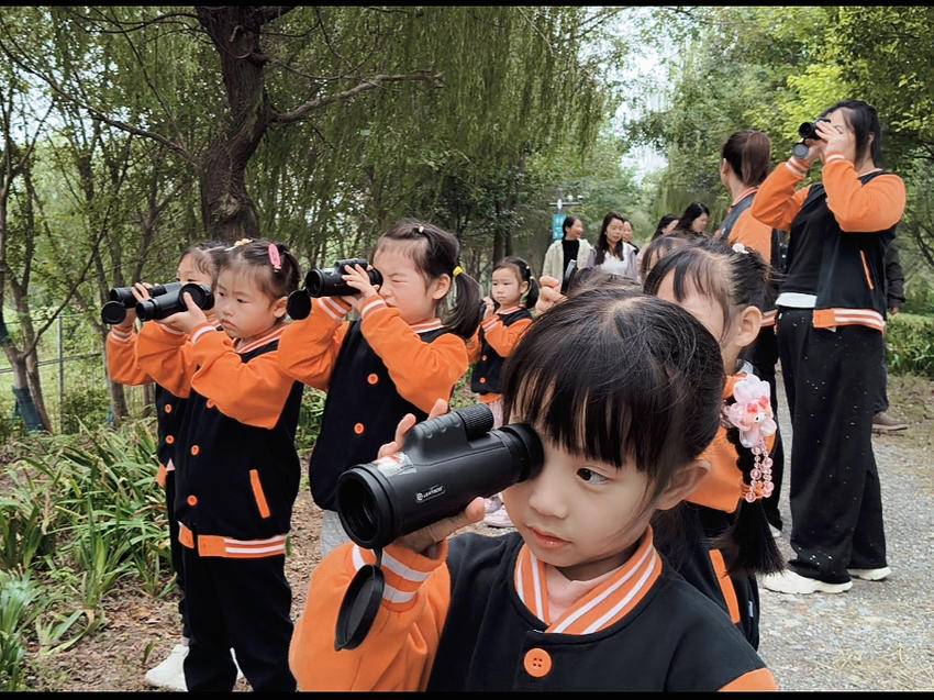 在麋鹿观赏区,孩子们举起手中的望远镜,观察麋鹿群在湿地草丛间悠闲栖息的身影;在江豚圈养区,孩子们兴奋地观看“江豚奶爸”投喂饵料、与江豚亲密互动的温馨场景。