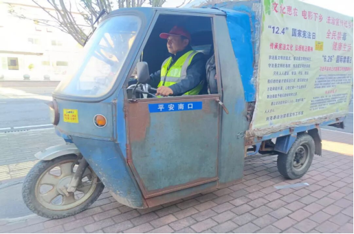 傍晚的霞光里,电影放映员张中平骑着三轮车缓缓前行,车厢里的喇叭没有播放悠扬的旋律,反而循环响起禁毒反诈的贴心提醒。作为南口义警“青苹果法治宣讲队”队长,他的三轮车早已不是单纯的放映工具:“车开慢一点,喇叭响一点,乡亲们多听一句,安全就多一分。”车厢里常备的急救包、打气筒和维修工具,更让这辆车成为行走在街巷的“流动服务站”,随时为需要的群众伸出援手。