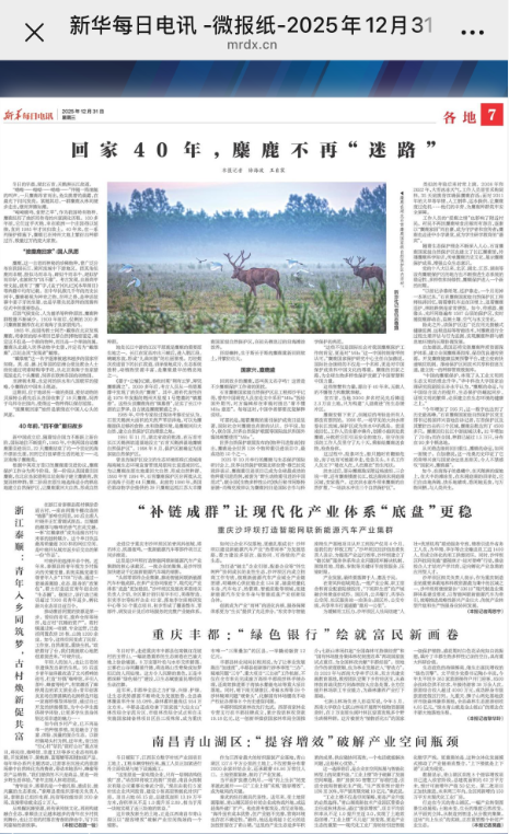 ●12月31日,《新华每日电讯》刊发文章《回家40年,麋鹿不再“迷路”》,聚焦石首麋鹿保护成果。