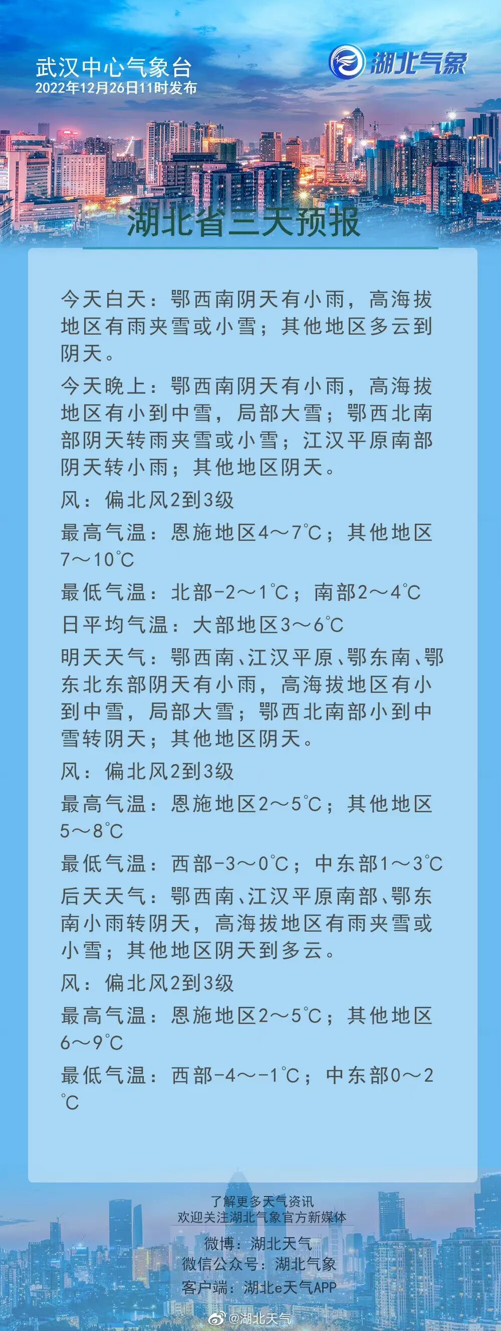 昨天(25日),我省西部地区阴天转小雨或小雪,其中十堰、襄阳、神农架、宜昌半高山以上地区出现中雪;东部地区多云到阴天。最高气温鄂西北3~5℃,鄂西南6~8℃,其他地区9~14℃。