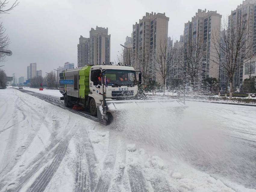 市环卫服务中心出动环卫工人260余人、扫雪、清扫各类专业工程车8辆,泼洒工业盐13吨。中心全体党员干部和志愿者在市城管局机关院落和山底湖大桥铲冰除雪,护航干部职工、环卫作业车辆出行路;清洗站负责在中心城区各主次干道撒盐除雪;清运站负责做好各中转站门前除雪工作;清扫站负责组织环卫工人在中心城区中央城、城市广场等核心商业圈开展除冰融雪作业。