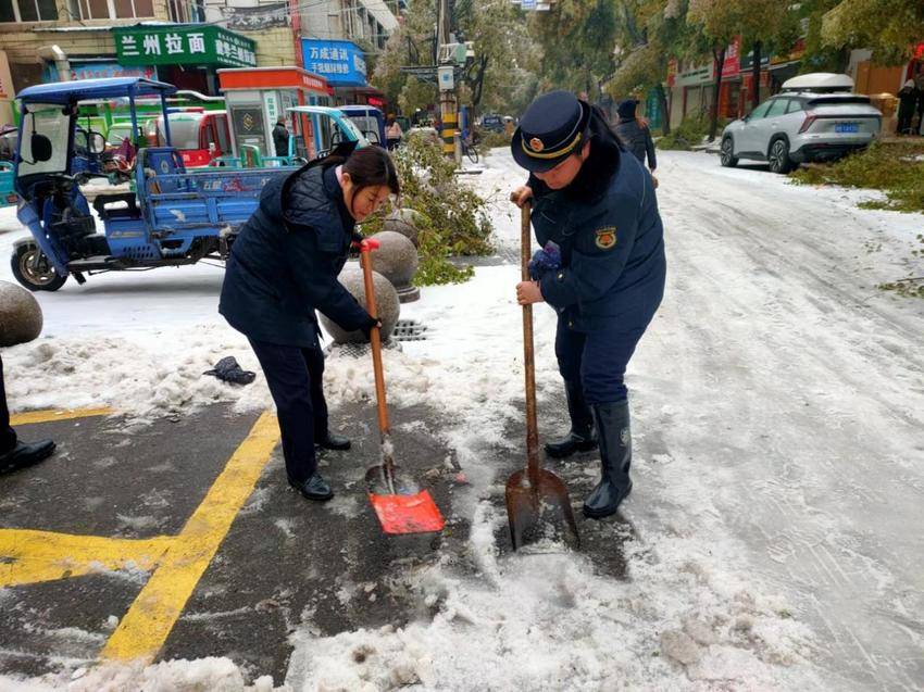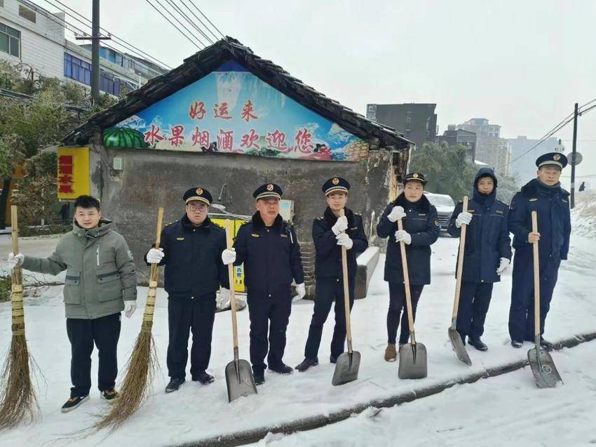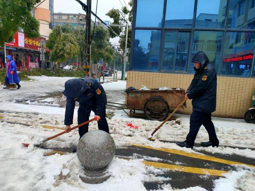 市城市管理综合执法大队出动执法人员65人,执法车辆11台,配备铁锹、扫把等装备工具,在山底湖大桥、南岳山路、建宁大桥、一小堤坡、衣铺街上坡等重点部位,开展除冰融雪作业。