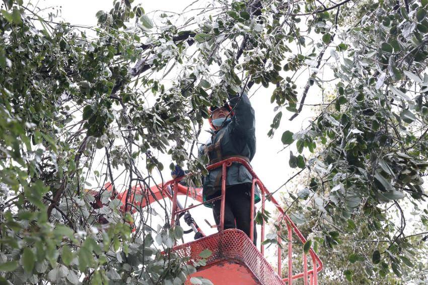 市政园林服务中心全员上路,安排90余名园林绿化管养工人,出动20余辆皮卡车,5辆保洁车,第一时间对城区各路段被冰雪压断的树枝进行清理、搬移,消除安全隐患,保障路面安全、畅通。