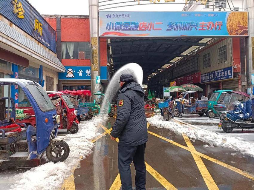 市市场服务中心出动干部职工和工人共50余人,皮卡车二辆,购买工业盐3吨,铁锹20把,防滑毯20卷,对各市场通道口、人行通道和天棚全面除冰融雪。