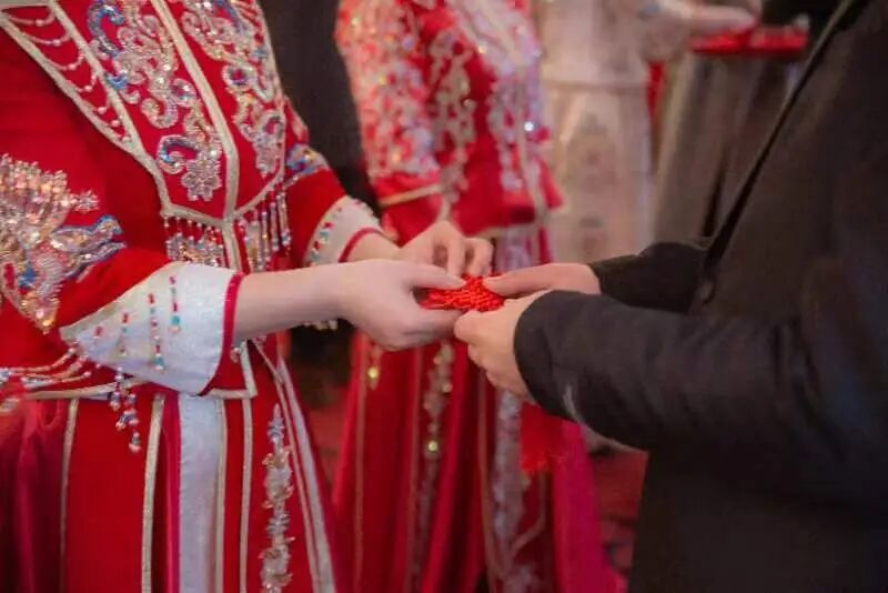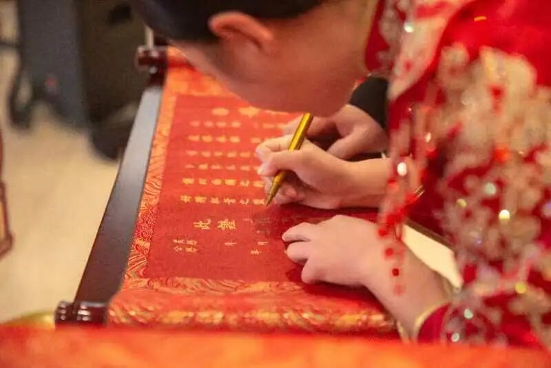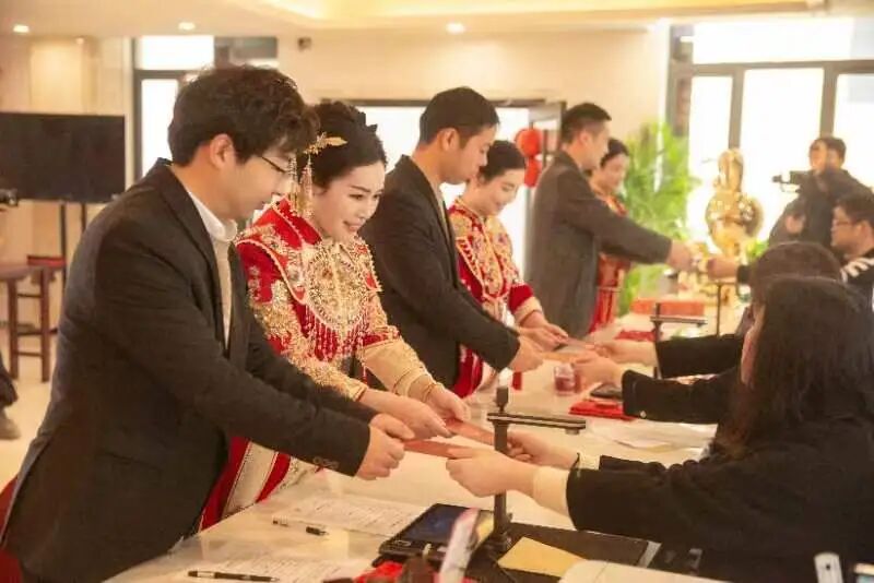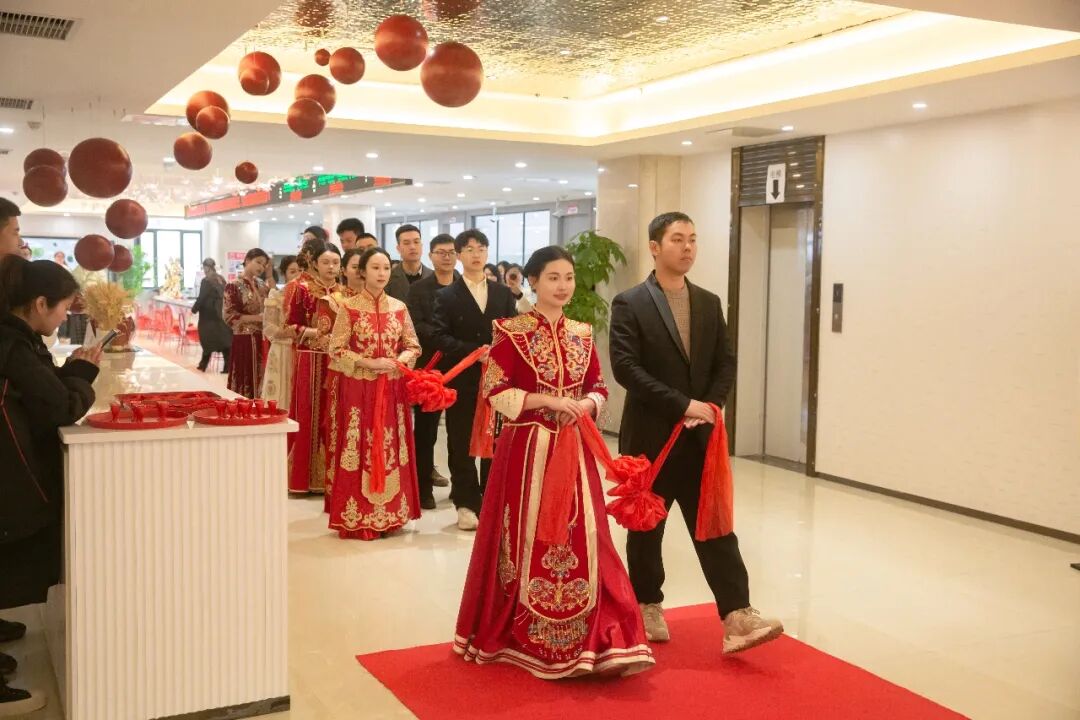 活动现场,新人们身着传统中式礼服,以中式婚礼的方式拜天地、饮交杯酒、宣读誓词,共同承诺将珍惜婚姻,关爱家庭、孝敬父母,心心相印、白头偕老。婚礼上,市民政局为他们颁发了婚书,一个个颇具仪式感的环节之后,在现场亲朋好友、嘉宾和工作人员的祝福中,新人们携手步入婚姻殿堂。