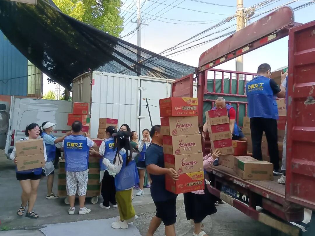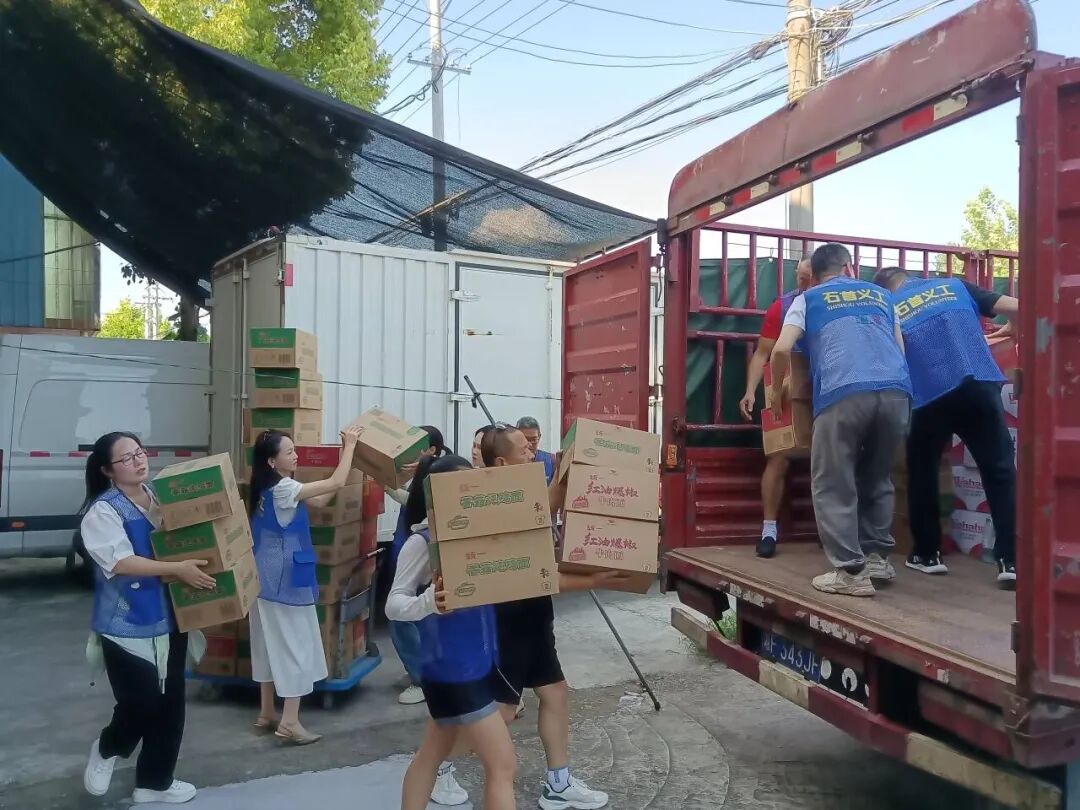 在市发展大道一处副食批发仓库门前,20余名义工和志愿者头顶烈日,争分夺秒将矿泉水、方便面、面包、毛巾、牙刷、香皂等一箱箱救灾物资搬运上车,大家心里充满了对灾区群众的牵挂。受爱心义工的影响,当地徐锋果蔬、两湖优选等企业和普通商户也纷纷加入为灾区捐款捐物的行列,通过自觉行动奉献一份爱心。