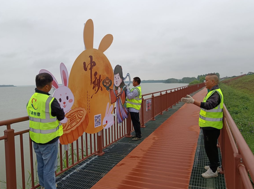 9月29日,笔者在天鹅洲江豚湾(老码头)活动现场看到,舞台搭建与现场布置工作已正式启动,施工团队正加紧安装各类景观打卡点,浓浓的中秋氛围正逐步成形。