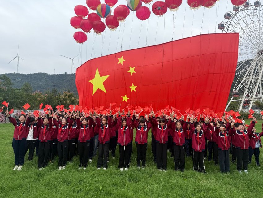 活动期间,景区上演了气势恢宏的广场舞展演,来自全市各地的千余名广场舞爱好者身着统一服饰,精神饱满,以充满活力的舞姿表达对祖国的美好祝福,展现出积极向上的精神风貌。在景区内开阔的草坪区域,一面巨幅国旗迎风高悬,为游客打造一处抒发爱国情怀的热门打卡背景。来自桃花山镇的小学生们聚集在国旗下,手中挥舞着鲜艳的五星红旗,齐声高唱《我和我的祖国》,以童真的心声唱响对祖国的无限热爱与崇高敬意。