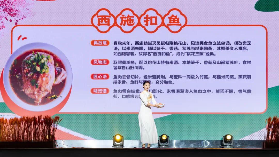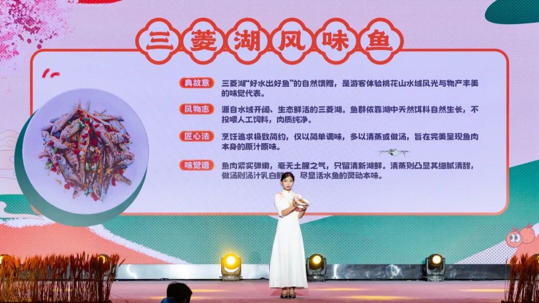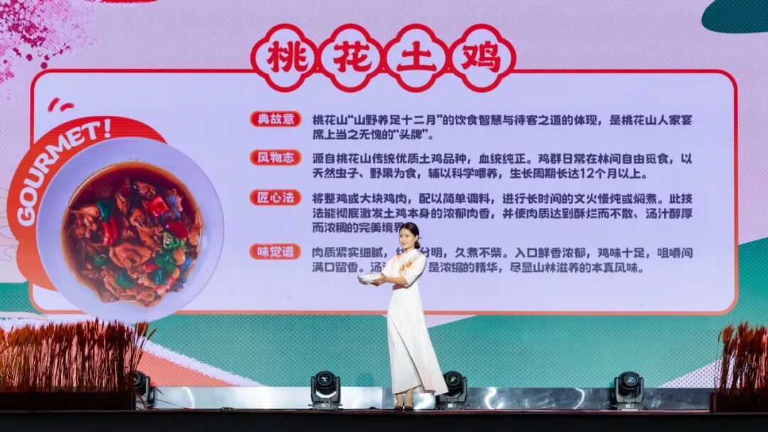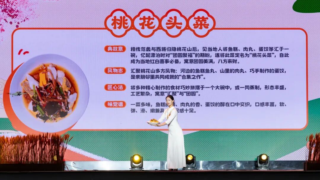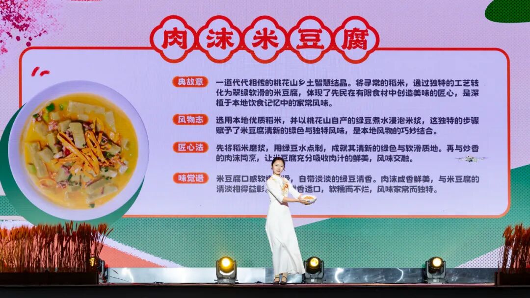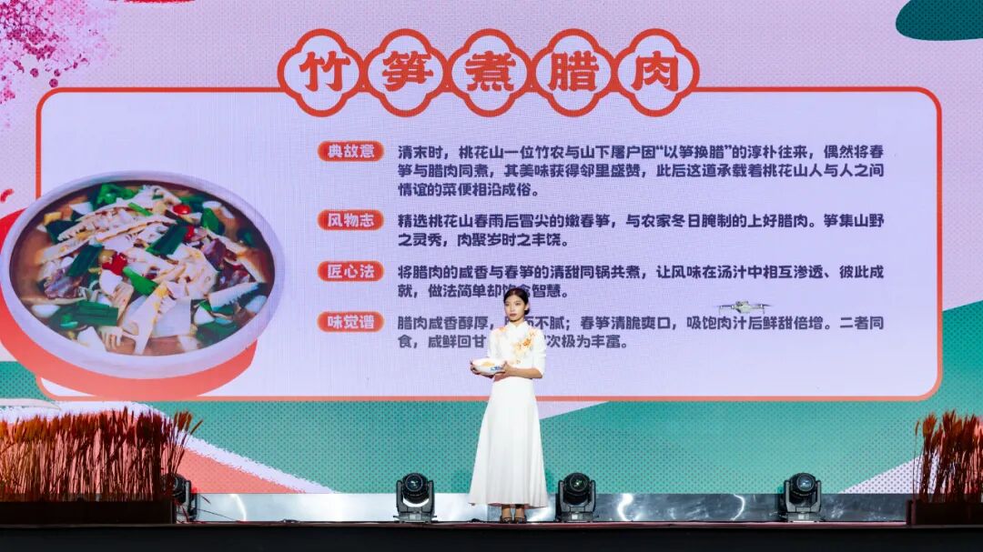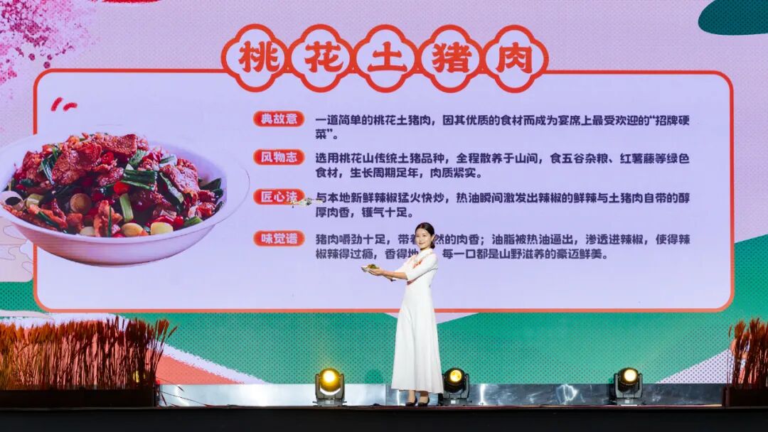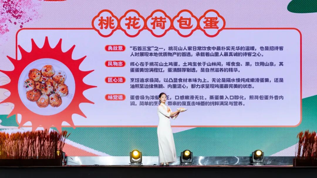 发布仪式在激昂磅礴的《天下第一鼓》表演中拉开序幕。活动现场,桃花土鸡、竹笋煮腊肉、肉沫米豆腐、西施扣鱼、桃花土猪肉、桃花荷包蛋、三菱湖风味鱼、桃花头菜等八道具有地方代表性的菜肴,通过“模特展示+多媒体解读”的形式逐一亮相。每一道菜都承载着桃花山的物产特色与人文故事,使“八大碗”超越饮食本身,成为展示石首市风土人情、传承地域文化的重要窗口。