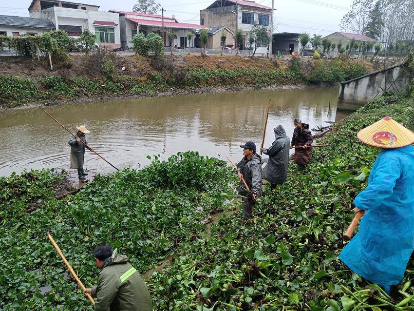 打井窖泵站栅栏被流水带来的“水葫芦”堵塞,排水效率骤降。10名“清漂”人员接到工作指令后火速赶到现场,分工协作冒雨清理,有人站在简易浮桥上用长杆打捞渠中“水葫芦”,有人徒手清理挂在栅栏缝隙间的杂草,有人在渠道两边负责将水草上岸转运。经过近一小时的奋战,堵塞的栅栏畅通了,泵站水流也恢复正常。