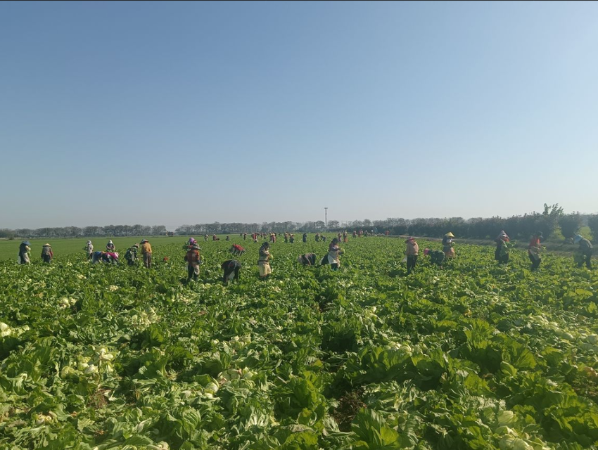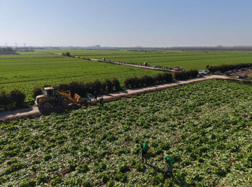 在天心洲村芥菜种植基地,工人们分工明确,采摘、割兜、去叶、搬运一气呵成,农用拖拉机穿梭田间及时转运采收的芥包,现场一派繁忙。公司负责人介绍,种植的包心芥菜,亩产可达12000斤,总产量预计达1200万斤,采收期将持续一个月。