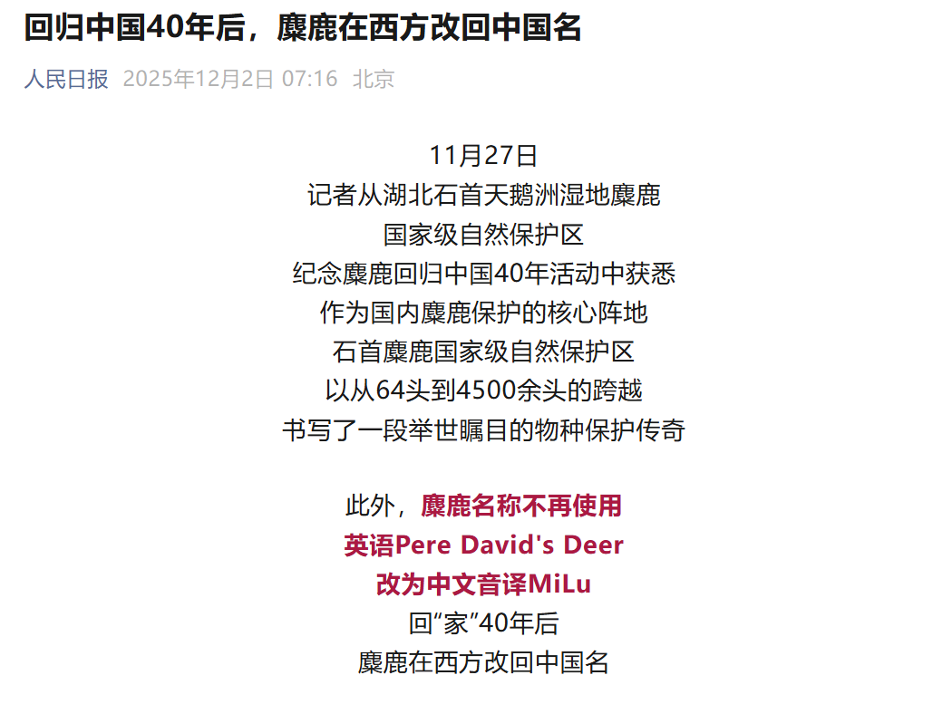 ●12月2日,《人民日报》微信公众号刊发《回归中国40年后,麋鹿在西方改回中国名》,聚焦石首麋鹿保护成果。