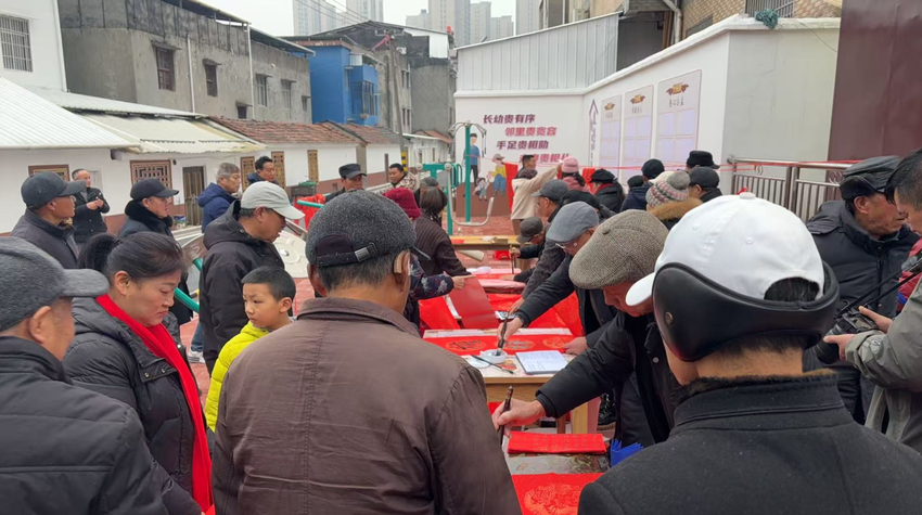 文艺表演间隙,工作人员为小区先进典范颁发荣誉奖项,表彰其在邻里和睦、家庭建设、社区服务等方面的积极贡献。一旁的春联摊位前聚满了居民,书法爱好者挥毫泼墨,将一副副春联和新春祝福送到大家手中。现场还设有禁毒反诈宣传、腊货展销、志愿理发等服务点位,居民收获满满。