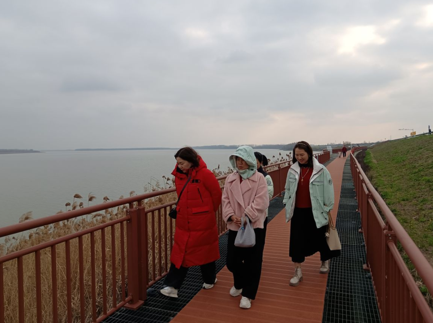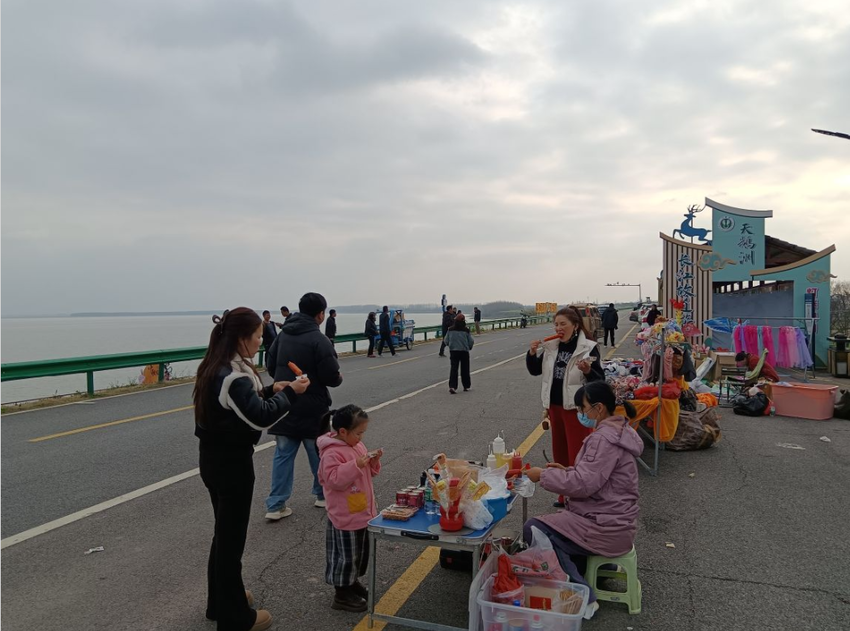2月24日,江豚湾游人如织、烟火升腾。栈道上,居民自发组织的户外KTV歌声不断;小吃摊、玩具摊前围满孩子和家长,浓浓年味与生态美景交相辉映。不少游客专程带着家人漫步江边栈道,期盼一睹江豚身影。在一处生态展板前,父母耐心为孩子讲解麋鹿、江豚的保护故事,让新春出游平添一份生态教育的意义。