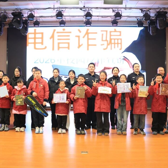 活动现场还播放了禁毒反诈主题微视频,真实案例改编的剧情,让同学们直观感受到毒品与诈骗离生活并不遥远。关键词解析环节,民警将专业知识转化为易记要点,帮助孩子们快速掌握识别技巧。随后的有奖知识竞答将气氛推向高潮。同学们踊跃举手、争相抢答,在轻松愉快的互动中,禁毒反诈知识悄然入脑入心。活动尾声,民警为每位同学发放禁毒反诈宣传单,鼓励大家将所学知识带回家,争当“家庭安全宣传员”,让一个孩子带动一个家庭,让一个家庭影响整个社会。