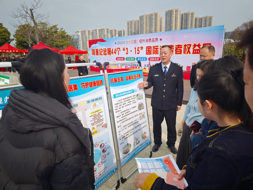 3月14日,在第44个“3·15”国际消费者权益日来临之际,石首市疾控中心在陈家湖公园南广场开展卫生健康主题宣传服务活动。活动以“诚实守信,合法经营”为导向,聚焦非法行医甄别、医疗美容与生活美容边界区分等民生重点问题,为市民现场送上健康消费维权实用指南。