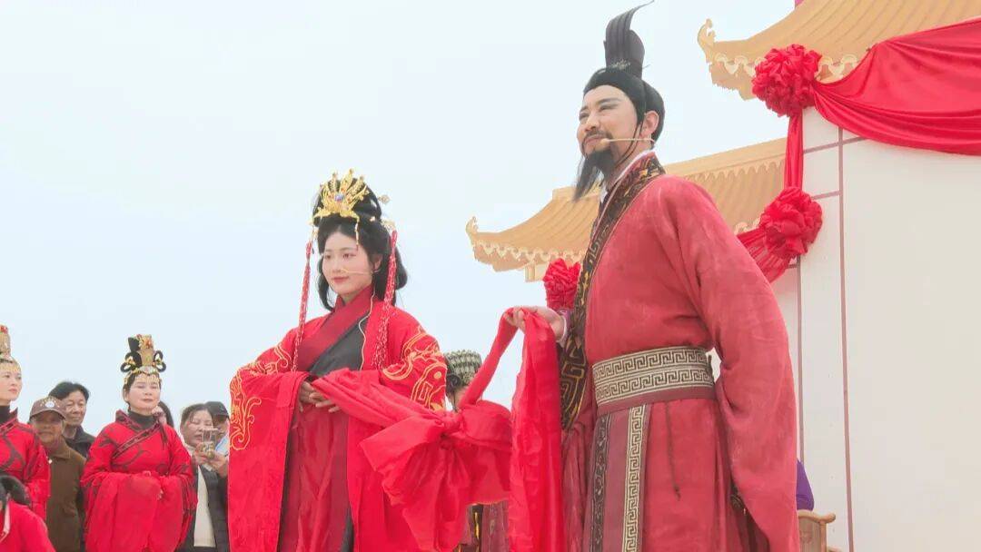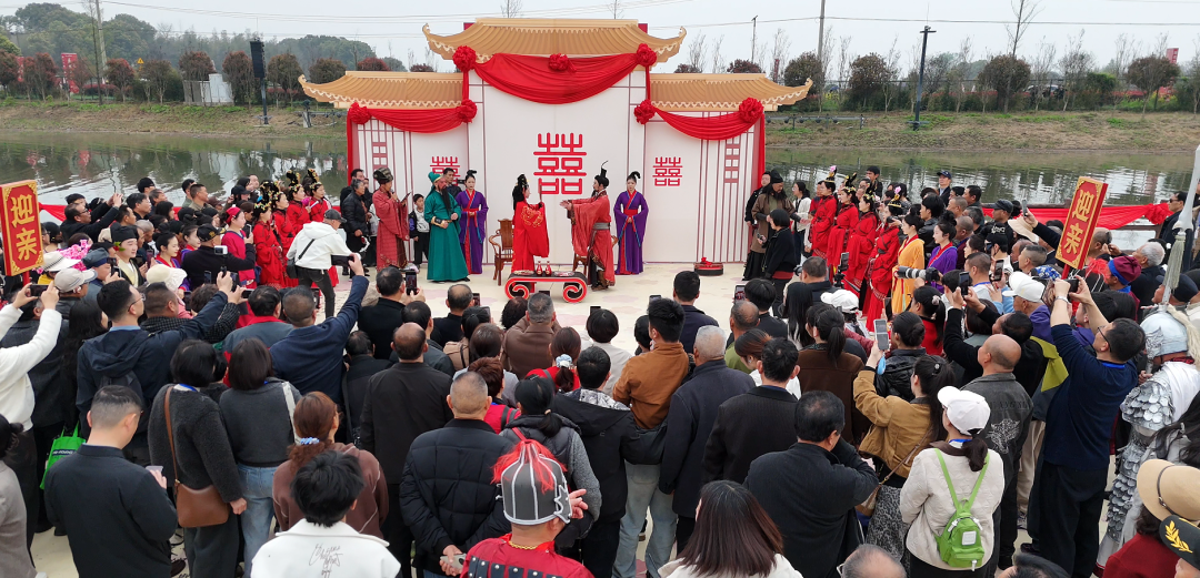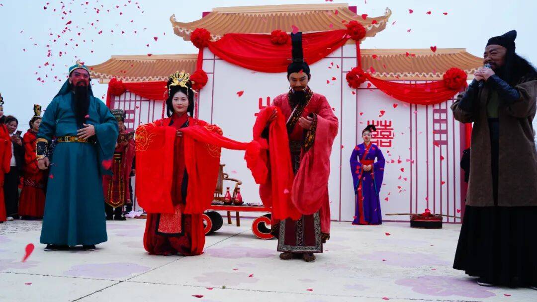 走进桃源小镇,游客便成了这场“汉婚大典”的受邀宾客。“拦门酒”的热情迎宾,瞬间拉近了游客与故事的距离。随后,关羽、张飞“喊麦互动”燃爆全场,赵云马术表演英姿飒爽,引得游客连连喝彩。