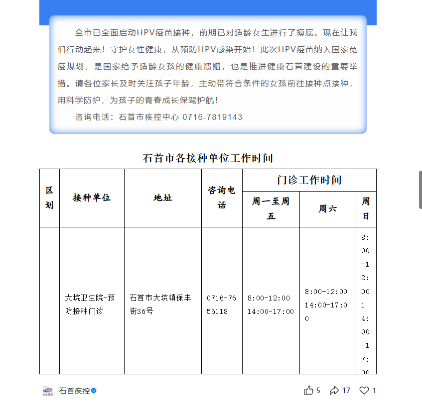 近日,石首市疾病预防控制中心发布公告,石首市正式启动适龄女孩HPV疫苗免费接种工作,符合条件的13周岁女孩可前往全市各接种点免费接种双价HPV疫苗,筑牢宫颈癌防控第一道防线。