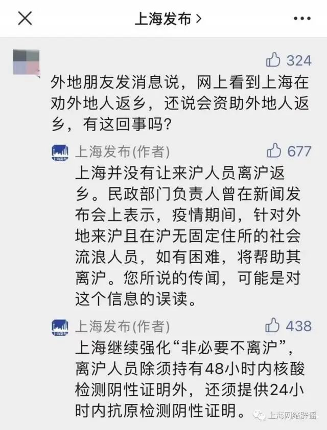对此,上海发布回答:上海并没有让来沪人员离沪返乡。民政部门负责人曾在新闻发布会上表示,疫情期间,针对外地来沪且在沪无固定住所的社会流浪人员,如有困难,将帮助其离沪。您所说的传闻,可能是对这个信息的误读。上海继续强化“非必要不离沪”,离沪人员除须持有48小时内核酸检测阴性证明外,还须提供24小时内抗原检测阴性证明。